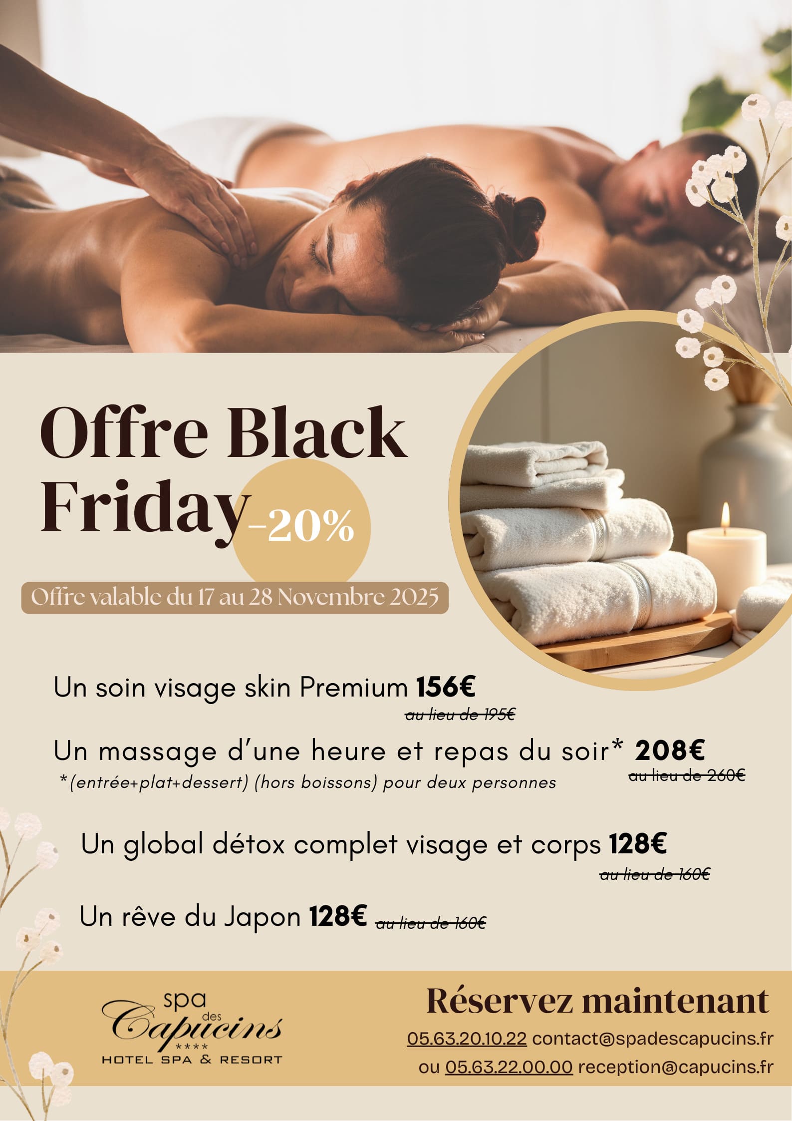 Du 17 au 28 novembre 2025, le Spa de l’Abbaye propose une sélection d’offres spécialement imaginées pour le Black Friday. Soins, packages bien-être et remises sur nos gammes premium : tout est réuni pour offrir (ou s’offrir) un moment hors du temps.